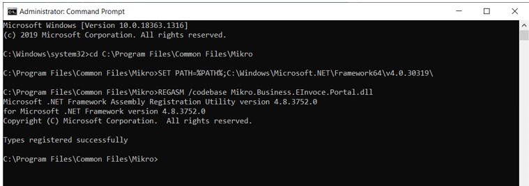 Yukarıdaki komutlar ile Mikro.Business.EInvoce.Portal.dll register işlemini gerçekleştirmiş oluruz. E-Mikro uygulamalarınızdan e-Fatura, e-Arşiv Fatura ve e-İrsaliye gönderim sırasında uyarı vermesini engellemiş oluruz.