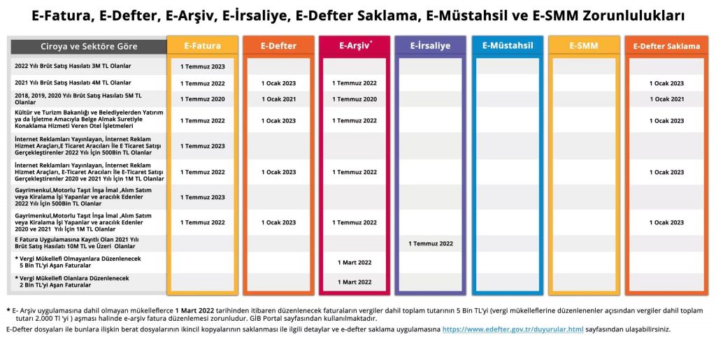 2021 yılı ciro limiti 4 Milyon TL olan işletmeler, e-Ticaret yapanlar, Gayrimenkul veya motorlu taşıt, inşa, imal, alım, satım veya kiralama işlemlerini yapanlar ve Kültür ve Turizm Bakanlığı ile belediyelerden yatırım veya işletme belgesi alarak konaklama hizmeti veren otel işletmeleri e-Fatura ve e-Arşiv Fatura zorunluluğu kapsamına alındı.